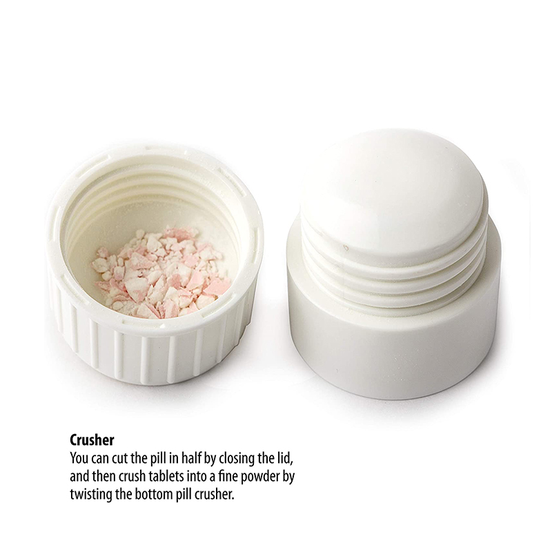 Você pode cortar o comprimido ao meio fechando a tampa e depois triturar os comprimidos até formar um pó fino girando o triturador de comprimidos inferior.