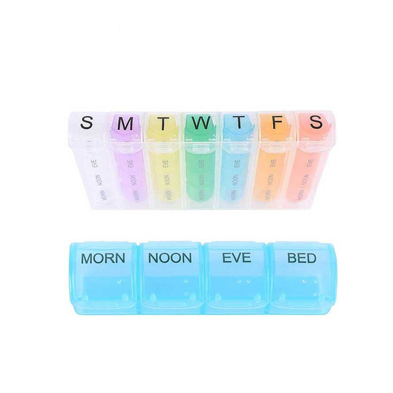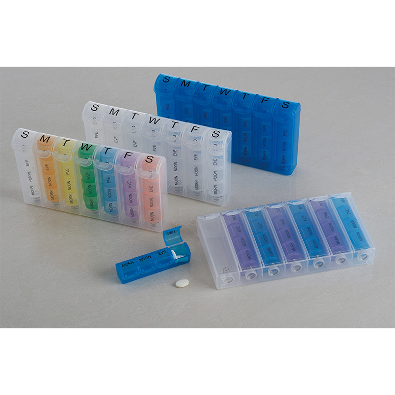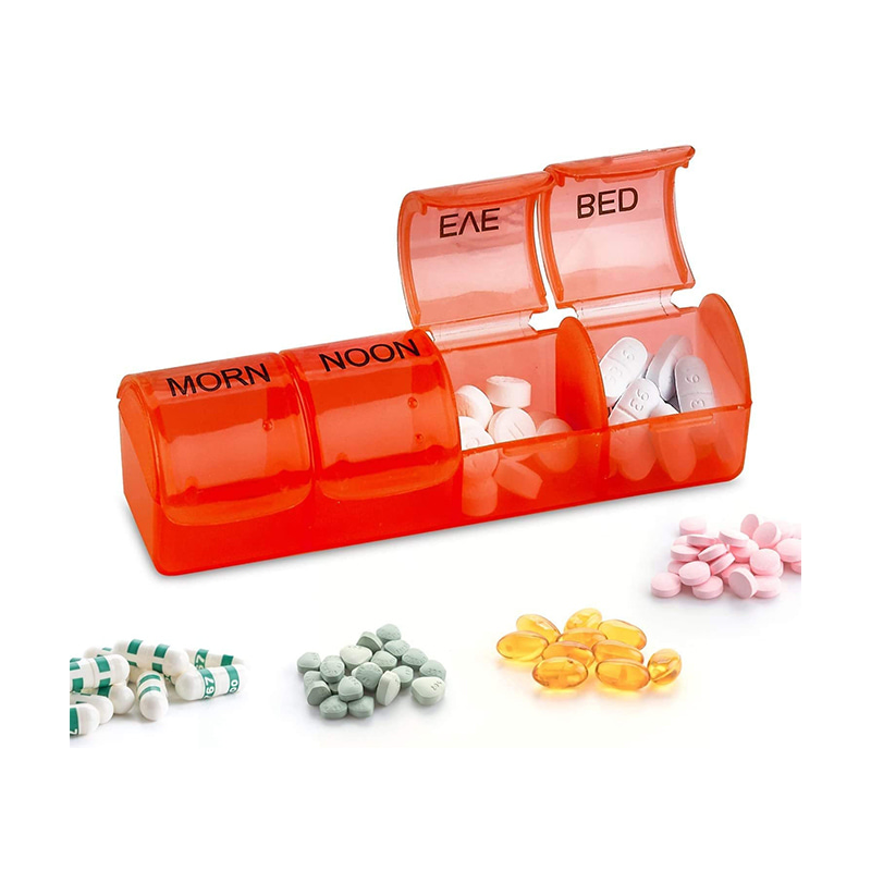 Nosso organizador individual de pílulas para cada dia abriga compartimentos para manhã, meio-dia, noite e hora de dormir.