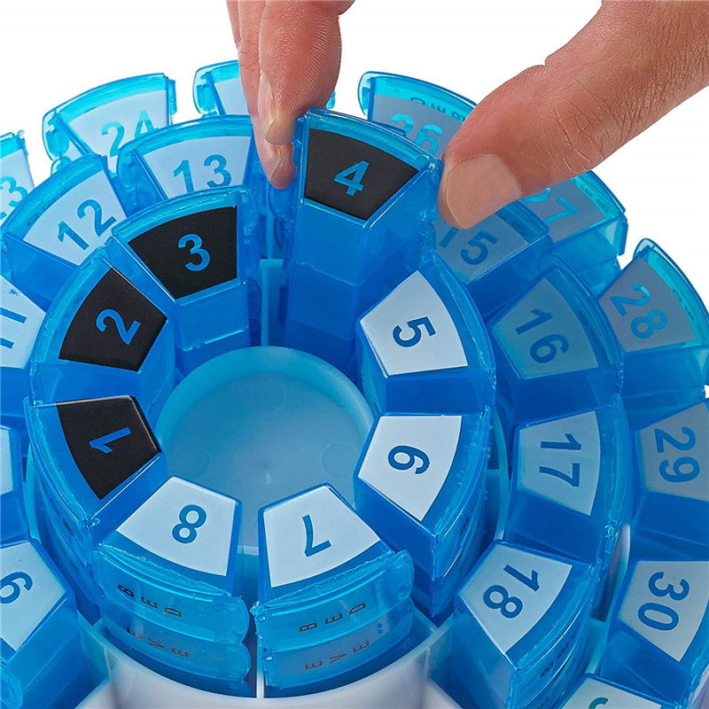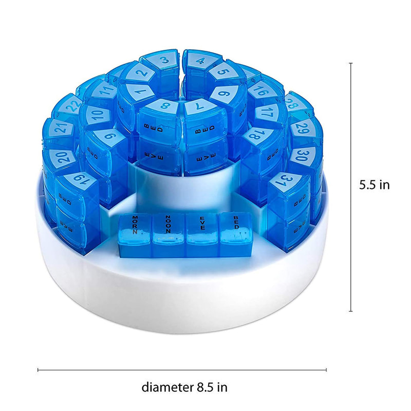 Este organizador mensal de comprimidos de baixo perfil permite que você configure seus medicamentos com um mês inteiro de antecedência.