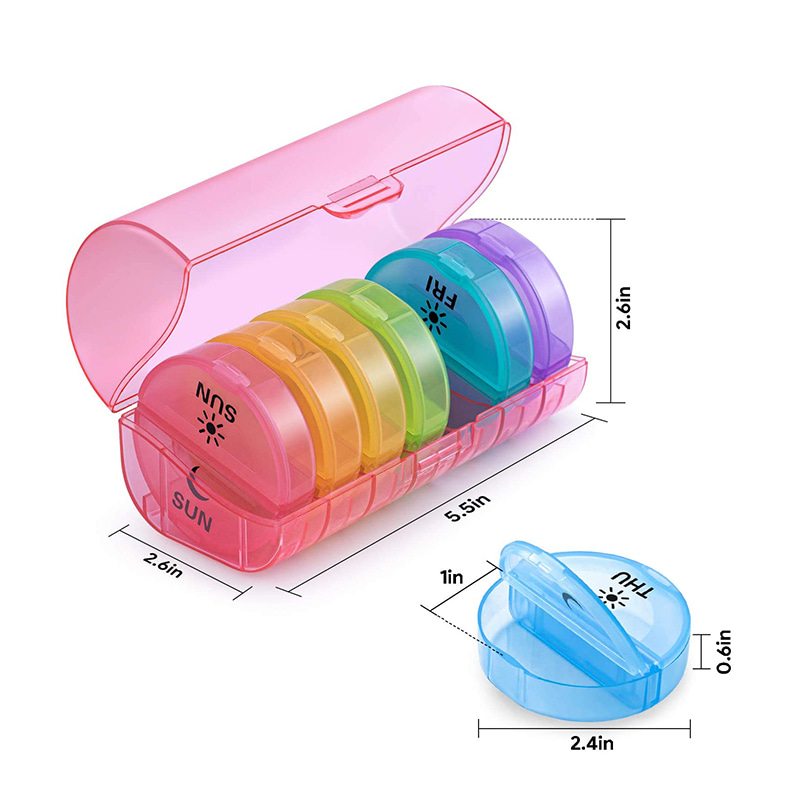 7 caixas individuais diárias de 7 cores permitem que você retire um ou alguns dias de remédio para tomar quando estiver fora.