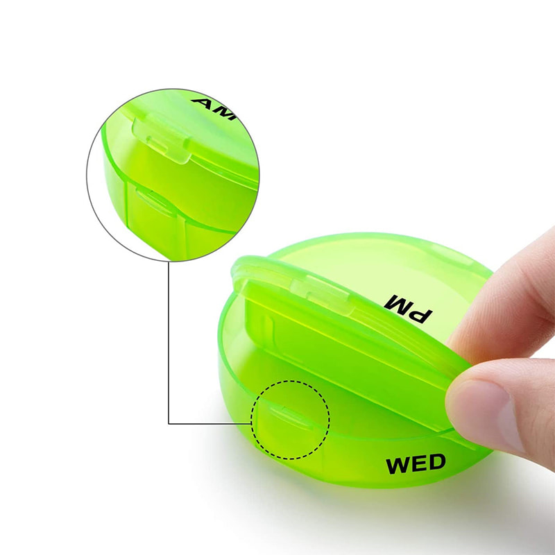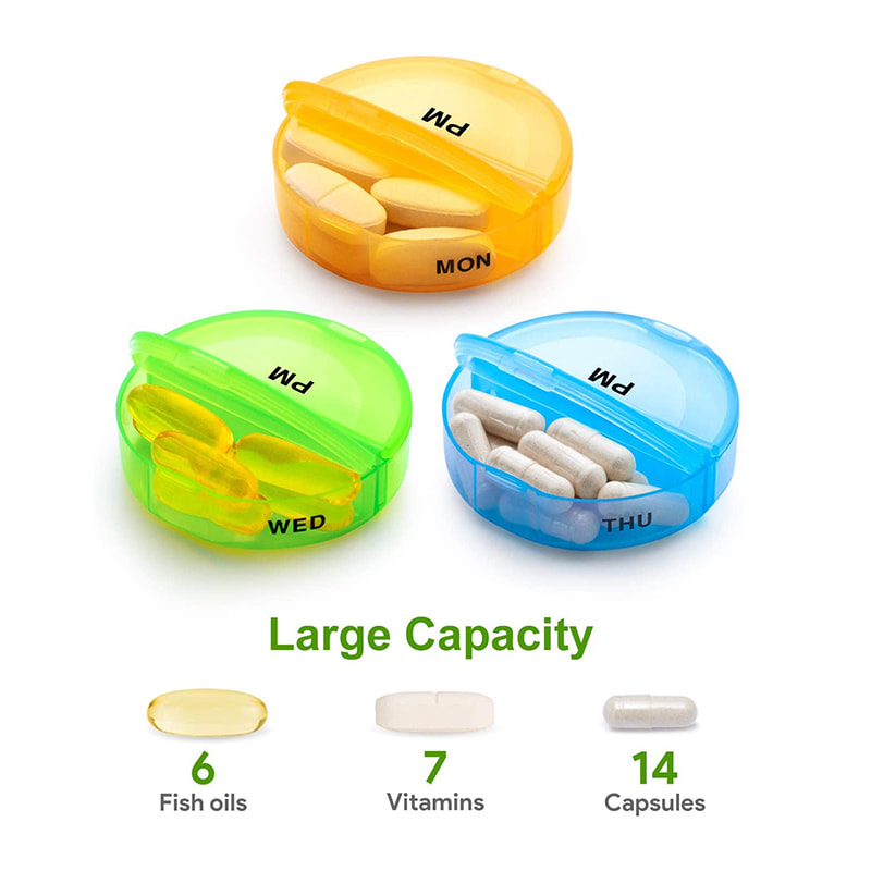 O organizador diário de caixas de comprimidos é removível e inclui 7 compartimentos grandes, cujo tamanho é tão grande quanto a palma da sua mão.