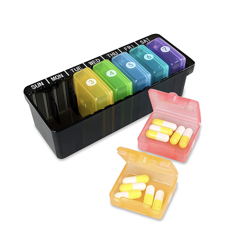 7 casamatas coloridas individuais permitem que você pegue uma que você precisa para o dia e coloque na sua bolsa ou bolso.