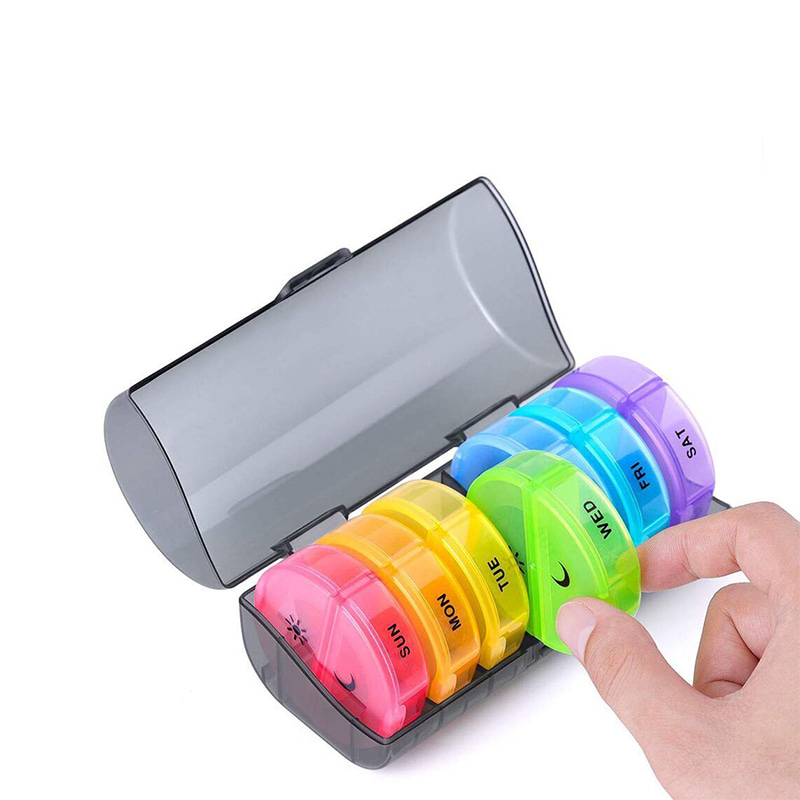 O recipiente externo durável e as caixas de comprimidos diários de qualidade alimentar com capacidade para 7 comprimidos mantêm seu medicamento seguro.