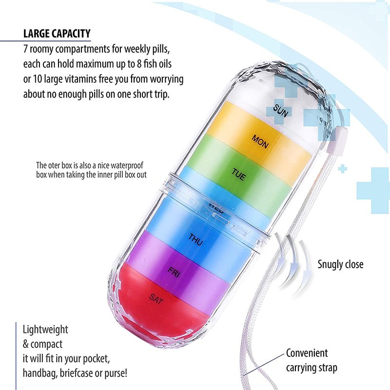 1 recipiente externo com alça e caixas individuais de 7 dias para evitar derramamento acidental e manter o medicamento seguro, seco e longe da umidade. Não abre automaticamente quando pressionado. A corda presa ao kit facilita o transporte.