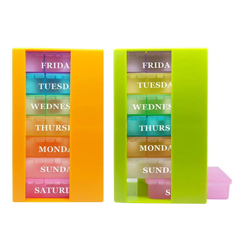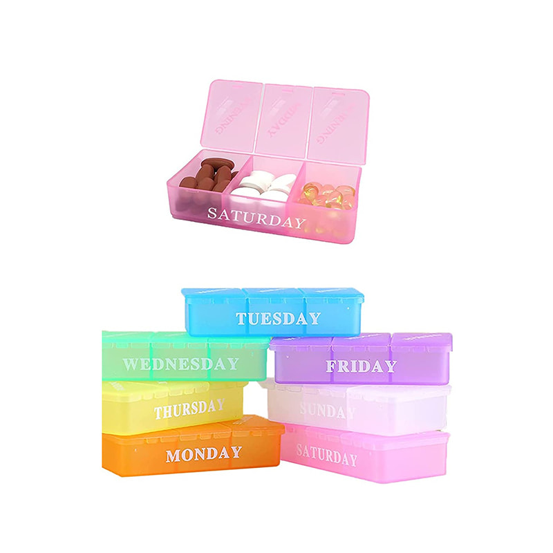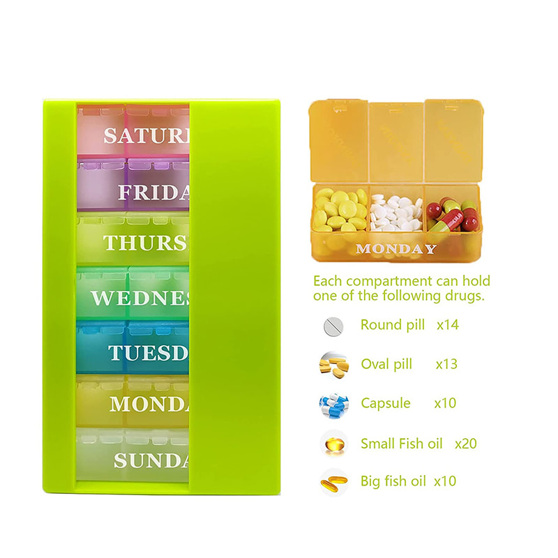O estojo semanal de comprimidos é fácil de carregar e acomoda todos os tamanhos de medicamentos, para que você possa planejar facilmente seus medicamentos da manhã / meio-dia/noite com uma semana de antecedência.