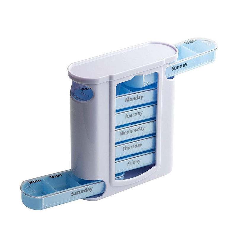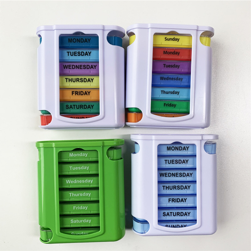 A caixa externa é projetada transparente e cada bandeja tem uma cor brilhante única para o usuário distinguir facilmente os dias da semana.